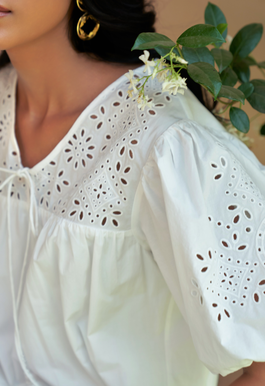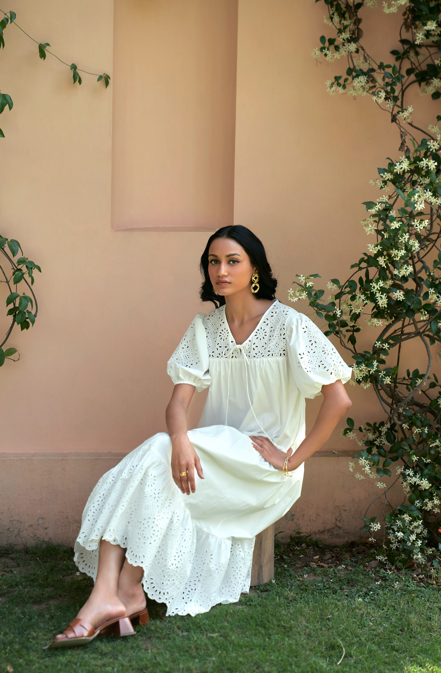 A beautiful white dress crafted in a crisp cotton poplin. It features intricate cut work embroidery. The dress is fairly over sized and of comfort fit. It also features hand crafted tassels and is fully lined.