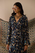 A shimmering statement piece, the Lantana Midi Dress is crafted in varying shades of deep blue with vertical lurex accents for just the right touch of glam. Designed in viscose georgette with full sleeves and elasticated cuffs, it balances elegance with comfort. The functional wrap style ensures a flattering fit, while an invisible button at the neckline provides added coverage. Finished at a timeless midi length, this dress is perfect for evening soirées.