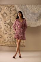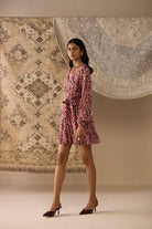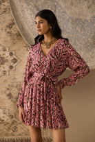 Romantic and playful, the Layla Mini Dress comes alive in a pink hue print adorned with gold jacquard dots for a subtle touch of glam. Crafted in lightweight viscose georgette and fully lined, it features a flattering V neckline, dropped shoulders for a relaxed fit, and elasticated cuffs for volume. The matching fabric belt cinches the waist to enhance the silhouette, making it perfect for both day-to-night dressing.