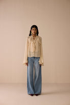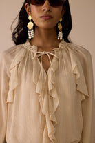 Bold yet feminine, this ivory-cream blouse is designed to make a statement with its dramatic neck ties and oversized sleeves. Crafted in luxe lurex chiffon, it shimmers softly while the frills and gathers add texture and volume—perfect for elevating your wardrobe with a touch of glamour.