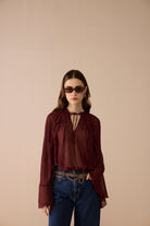 Luxurious and timeless, this merlot blouse with delicate gold lurex threads brings subtle shimmer and sophistication to any look. Designed with soft frills at the shoulder and gently flared sleeves, it’s the perfect balance of feminine elegance and modern ease—ideal for everything from daytime gatherings to evening soirées.