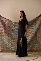 Effortlessly elegant, this maxi dress is crafted in a charming blue viscose georgette jacquard fabric. Featuring a flattering V-neckline at both the front and back, it is detailed with delicate ties near the neck for a feminine finish. The smocked back ensures comfort while the fitted waist flows into a graceful skirt with a subtle slit, adding ease of movement and sophistication. Short flowy sleeves complete the look, making it the perfect choice for elevated occasions.