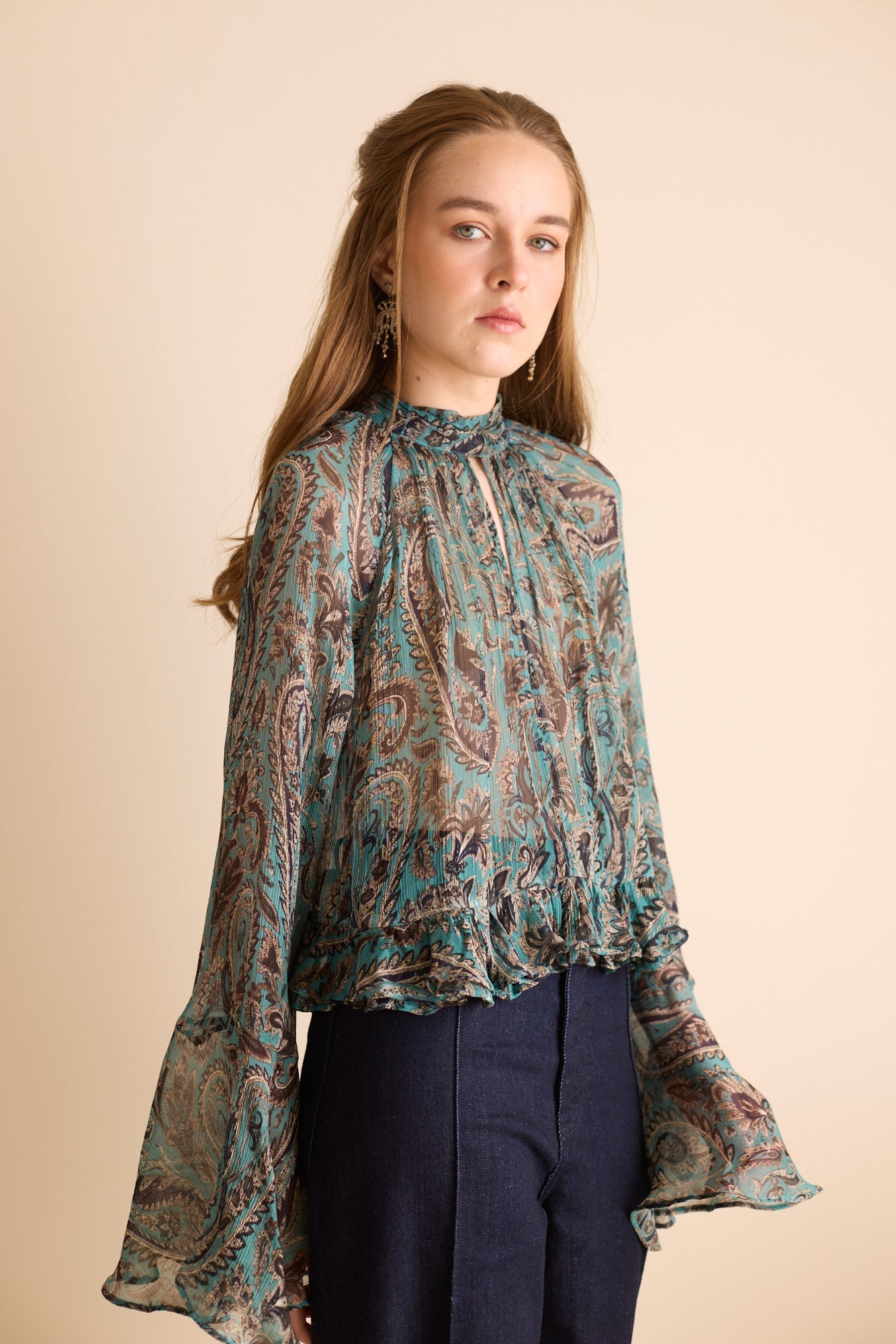 The Selena Blouse is crafted in airy viscose chiffon, designed with a romantic flair and effortless versatility. Slightly cropped with long, flared sleeves, it adds an elegant, dramatic touch to any look. The neckline features extended ties, allowing you to style it open or tied for a chic finish. What makes this blouse truly unique is its reversible design — there’s no front or back, giving you the freedom to wear it your way.