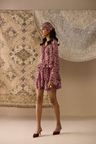 The Peach Mini Skirt features a breezy tiered silhouette crafted in lightweight viscose chiffon with a soft pink hue print. Fully lined and finished with an all-round elasticated waistband, it’s as comfortable as it is feminine. The Selena Blouse elevates the look with its airy, reversible design—slightly cropped with long, flared sleeves and extended ties at the neckline for customizable styling. Its versatility allows you to wear it your way, creating endless outfit possibilities.