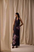 Showcasing a striking botanical placement print in romantic purple hues, this fitted maxi is perfect for both elevated daytime occasions and glamorous evenings.