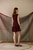 Chic and versatile, the Amelia Mini Dress is crafted in a rich burgundy viscose chiffon with gold lurex accents that shimmer subtly with movement. Intricate pleating and delicate frills elevate its minimalist silhouette, adding just the right amount of detail and charm. Designed to be fitted, the dress features an elasticated waist for comfort, while a back keyhole with button closure completes the look. Fully lined for ease, this dress transitions effortlessly from day to night.