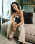 Elegant tailored trousers designed to pair seamlessly with the embroidered tube top. Crafted for a flattering silhouette, the co-ord set is your best pick for your next vacation.