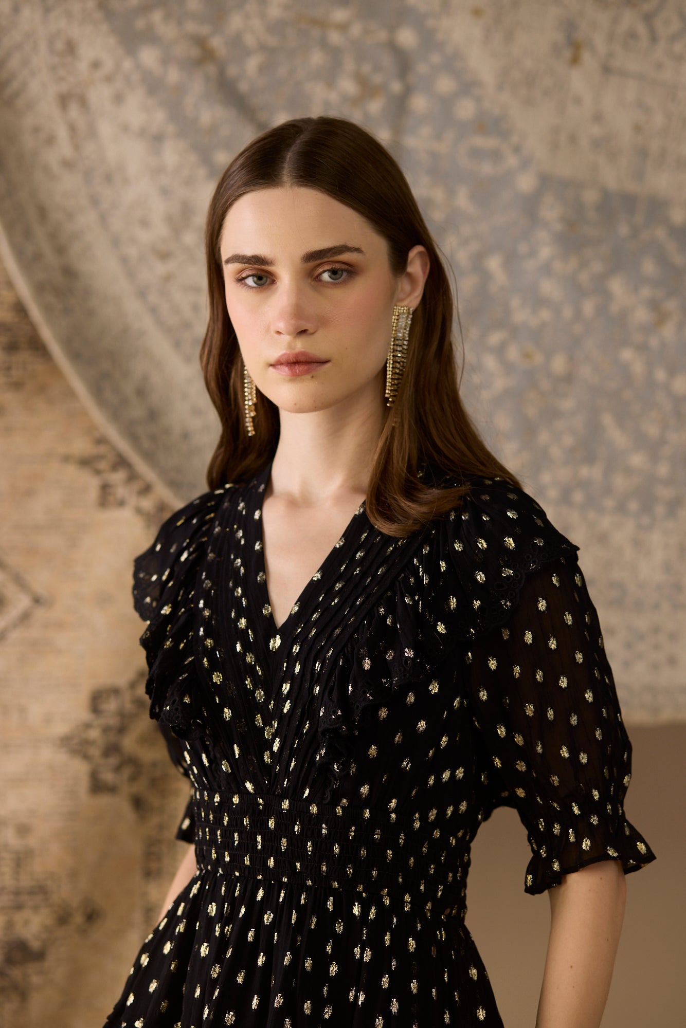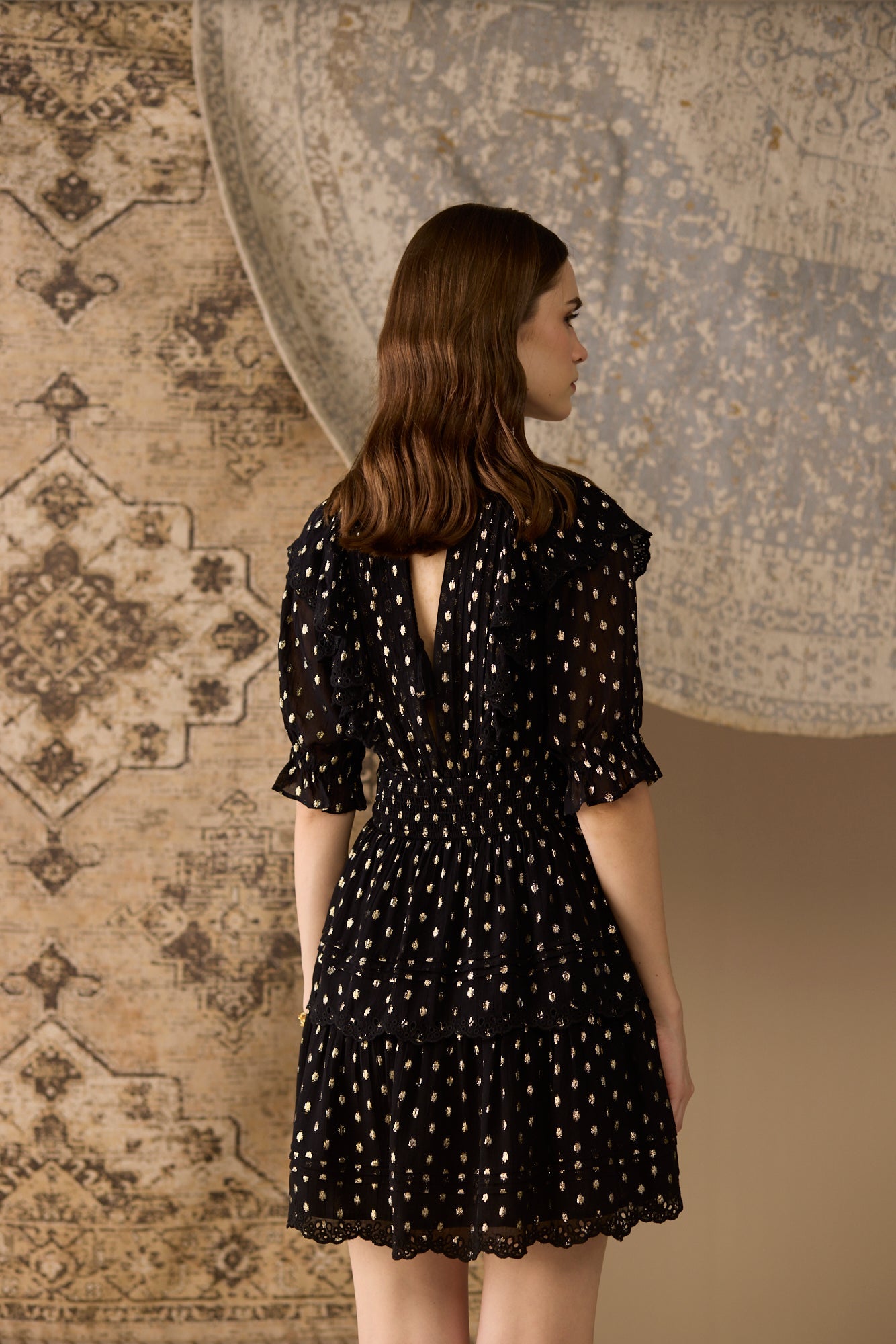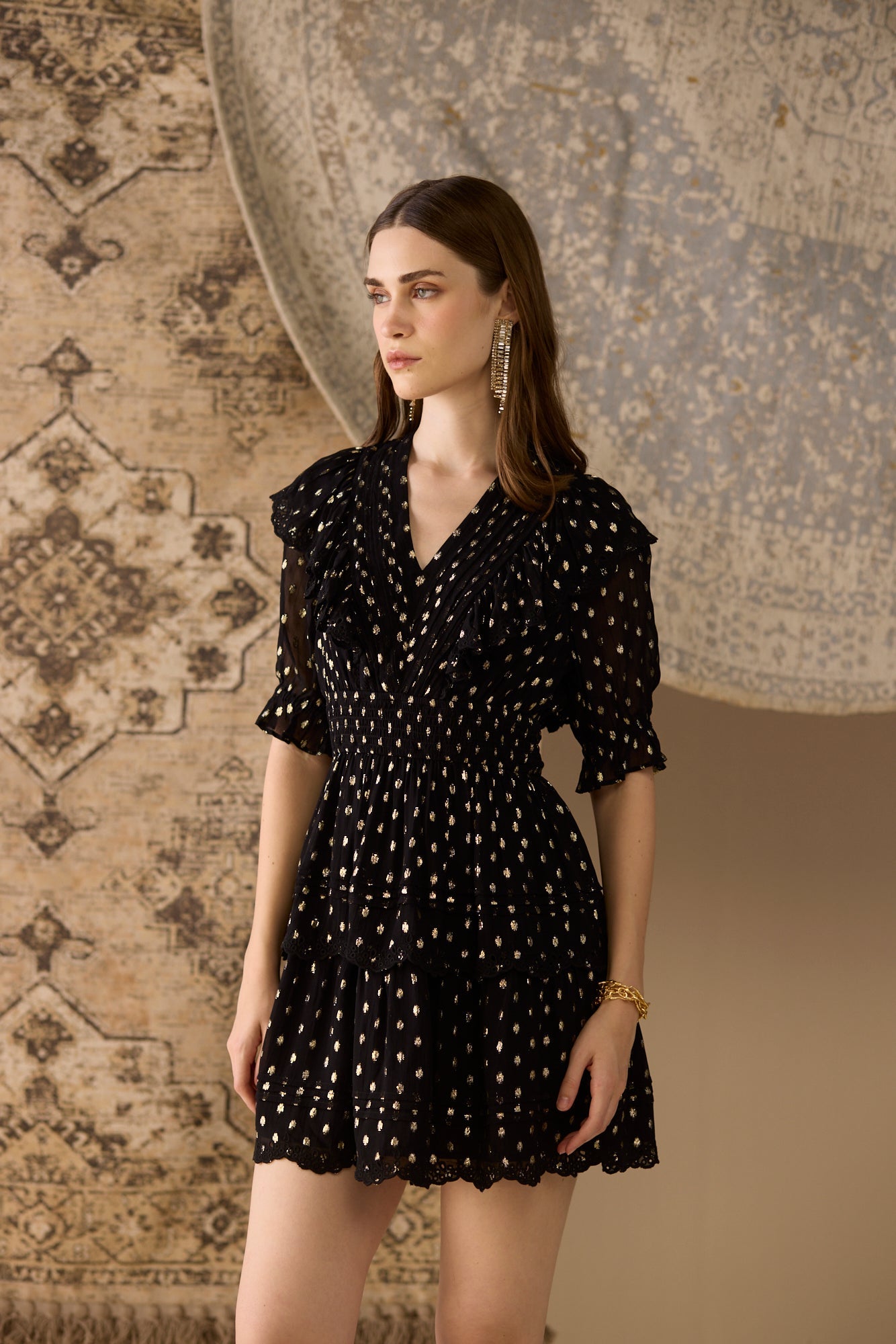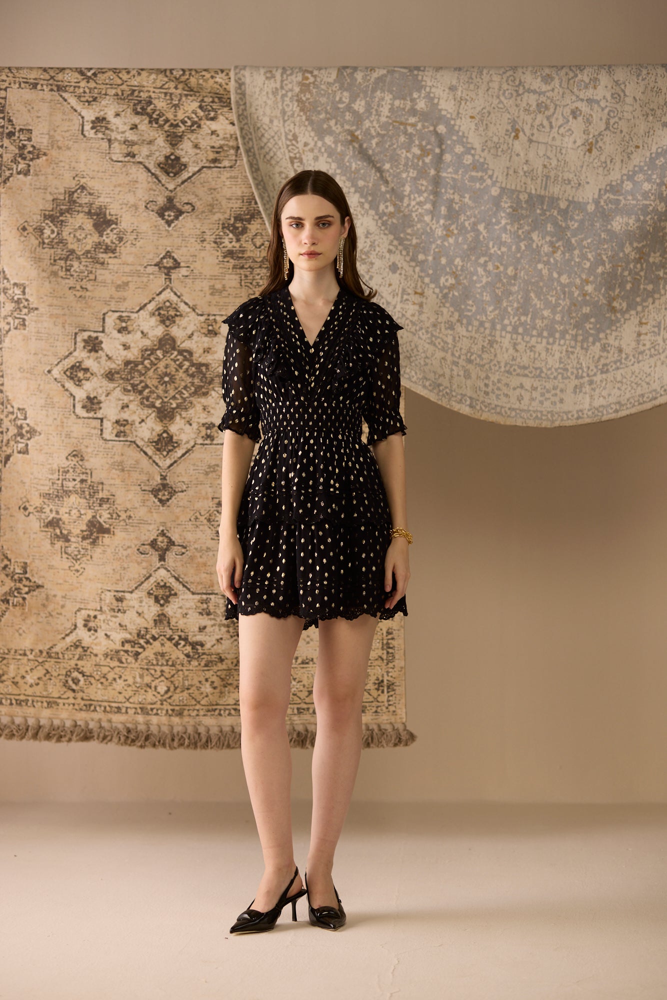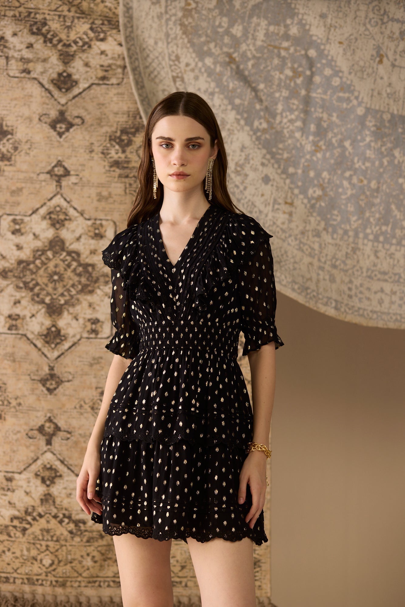 The Mira Mini Dress is a flattering and versatile piece designed to transition seamlessly from city nightlife to chic daytime styling. Crafted in black viscose jacquard, it features a V-neckline with delicate ruffle detailing, mirrored at the back with a tie-up closure for added charm. The elasticated waist ensures a comfortable yet cinched fit, while the tiered skirt creates soft, feminine movement. Finished with short sleeves and elasticated cuffs, this fully lined mini is as easy to wear as it is elegant.