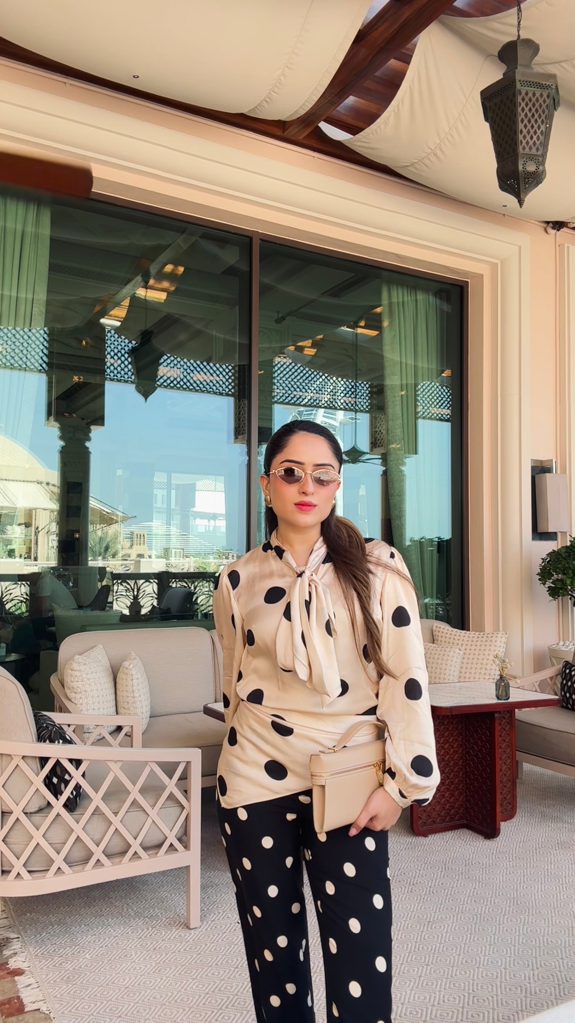 The blouse features a signature tie-neck detail that brings instant refinement, while its oversized silhouette adds ease and contemporary charm. Paired with the straight-leg Glam Trouser—crafted in a flattering mid-to-high waist with a sleek elongating cut—the set creates a coordinated look that’s both versatile and statement-making.