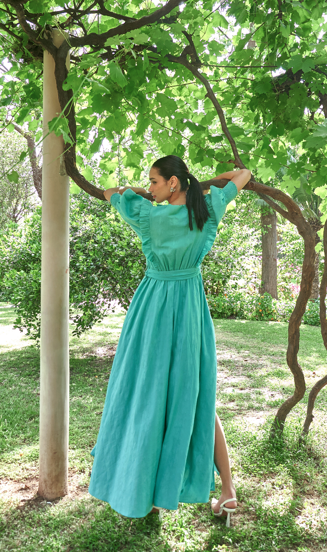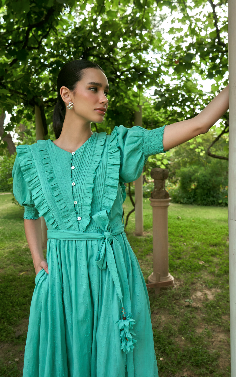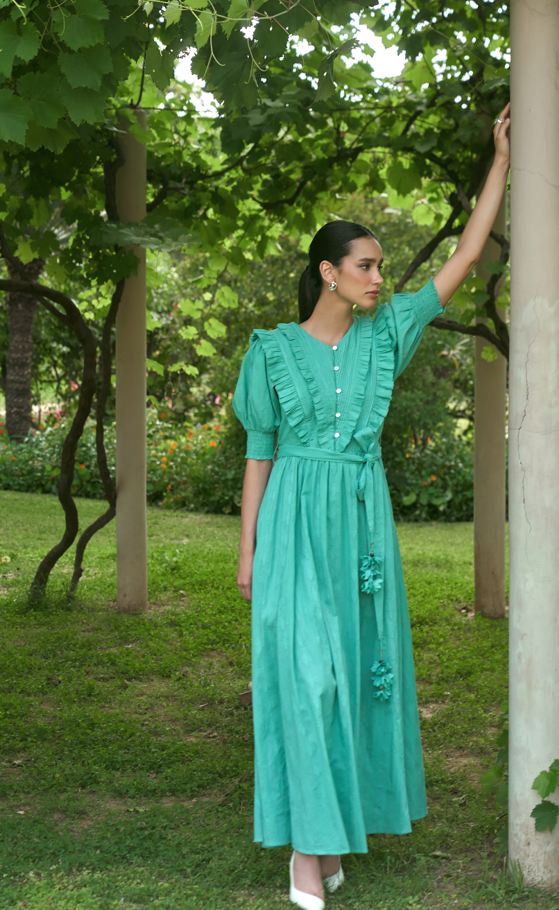 A beautiful maxi dress made in a cotton jacquard fabric. The dress features pintucks and ruffles on the front bodice. The dress is fairly over sized and of comfort fit. It also features hand crafted tassels and is fully lined.