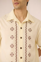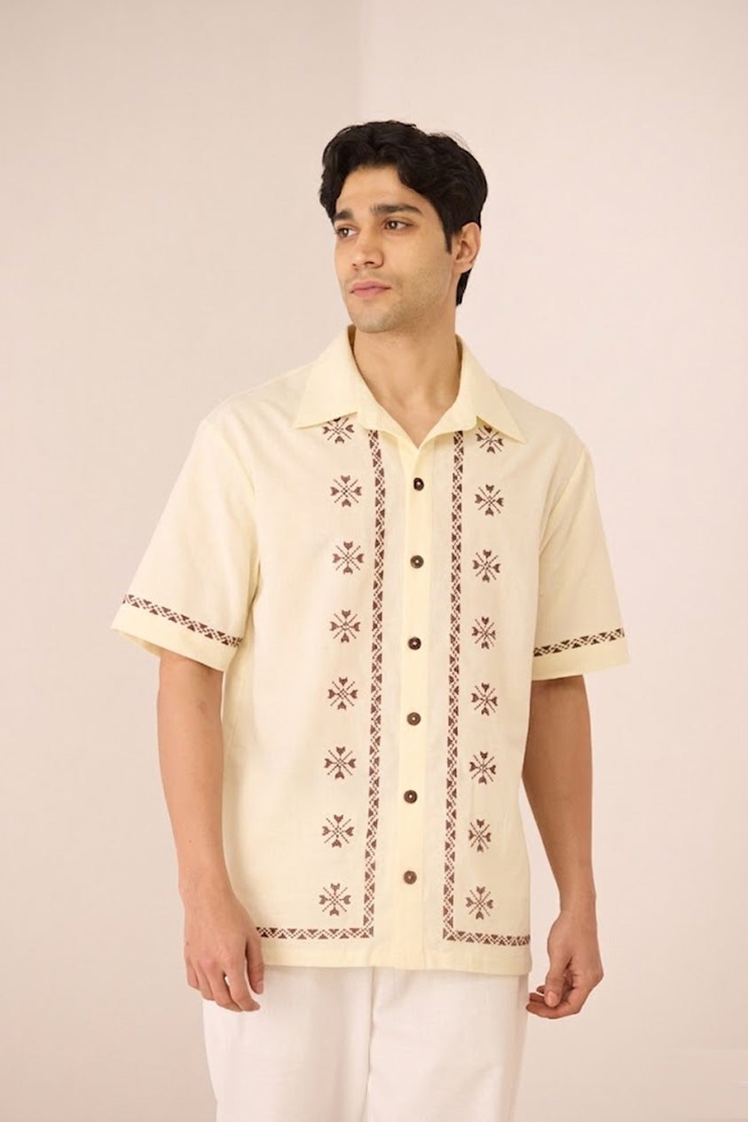 Timeless with a refined edge, this ivory short-sleeve shirt is accented with subtle embroidered motifs and delicate contrast detailing along the placket, sleeves, and hem. Designed with a relaxed silhouette and classic collar, it offers an elevated yet effortless approach to everyday dressing. Crafted in a soft, breathable cotton linen fabric, it feels lightweight and comfortable from day to night.