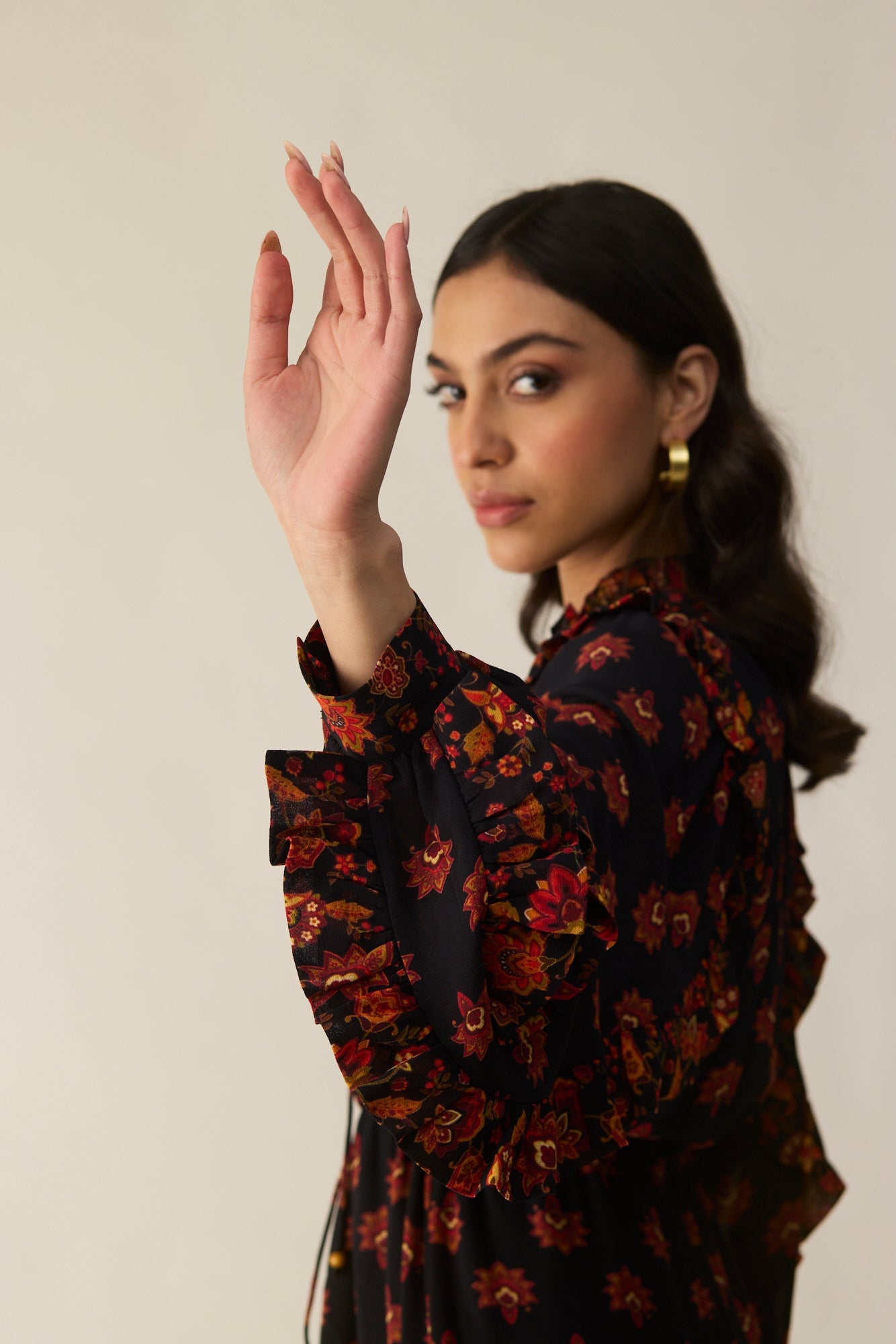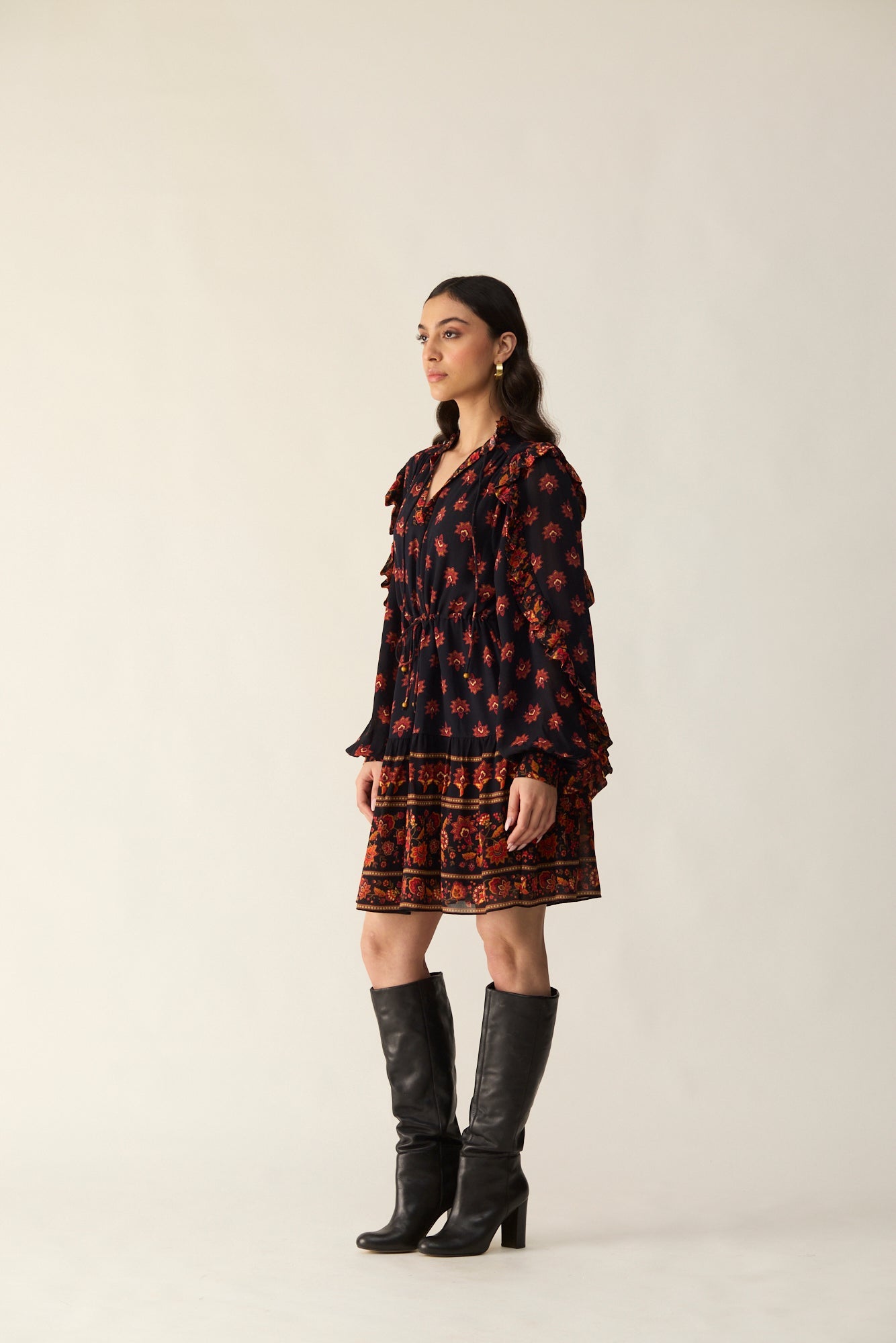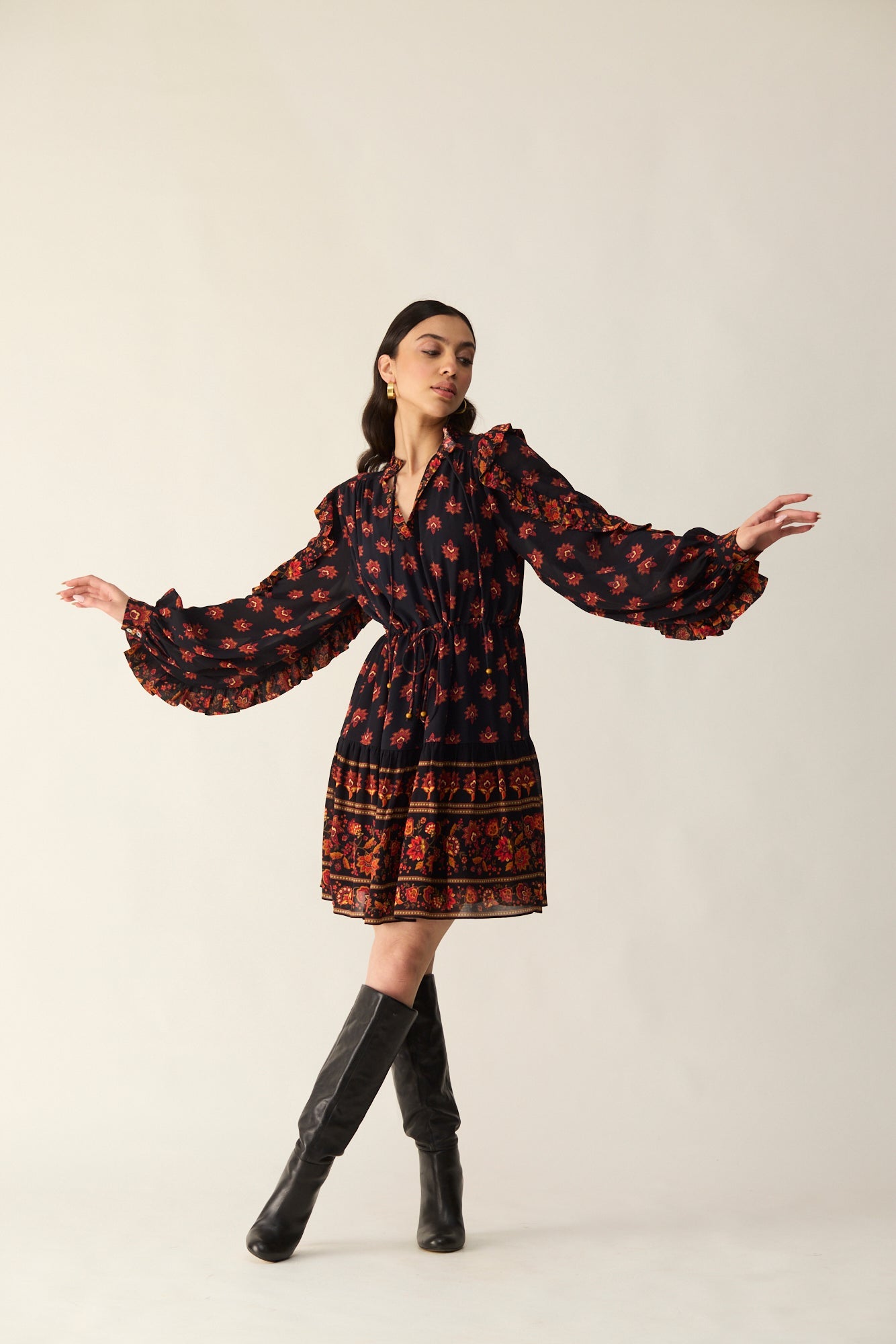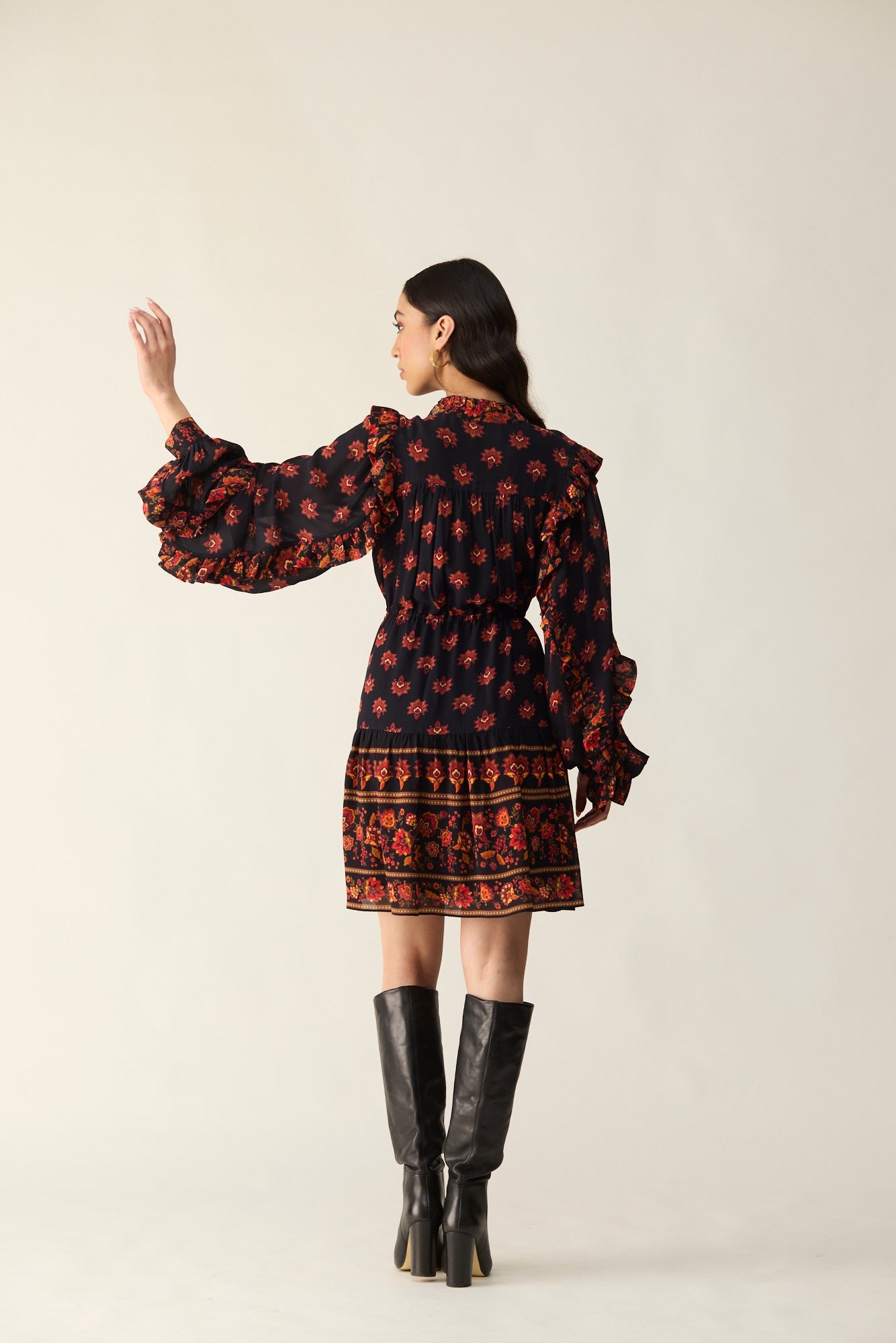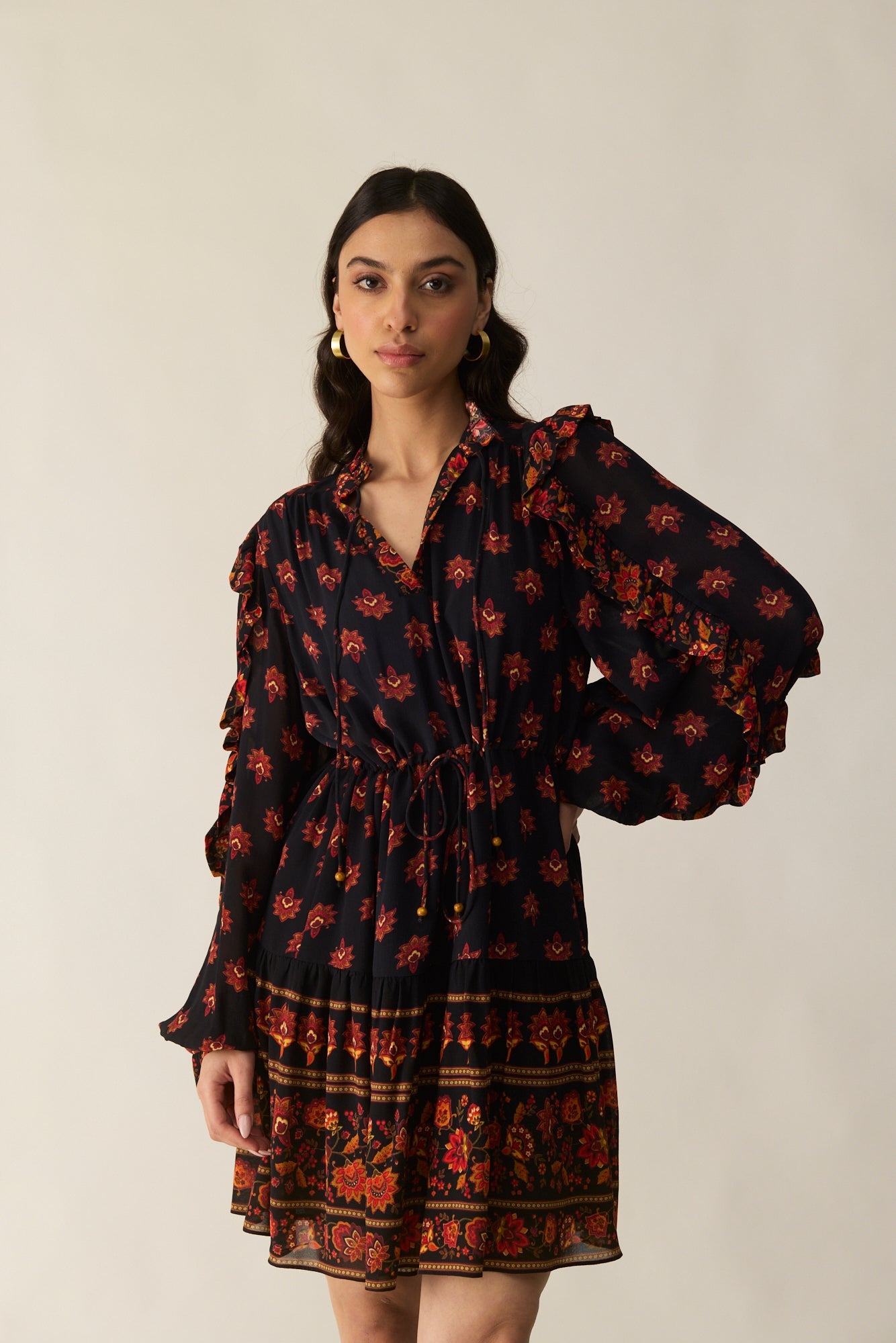 Limelight mini dress features a charming tie around the neck and waist for a touch of versatility and femininity. The sleeves are adorned with playful frills, adding a delightful flair to the ensemble.