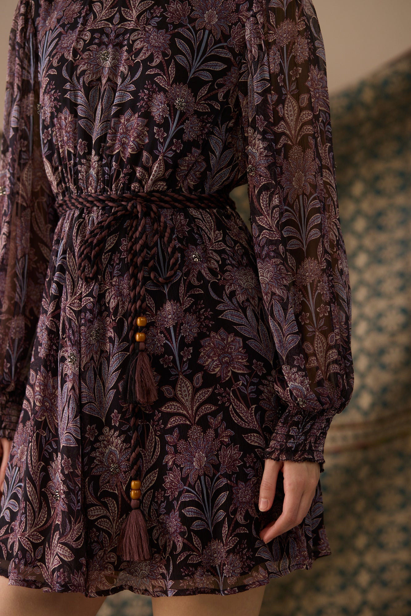 Feminine and refined, the Mehr Mini Dress is crafted in a botanical viscose chiffon print with scattered hand-embroidered motifs that add artisanal charm. Featuring long voluminous sleeves with smocked cuffs for ease and comfort, it strikes the perfect balance of elegance and wearability. A waist belt cinches the silhouette for a flattering fit, while the back keyhole closure adds a delicate finishing touch. Fully lined for comfort, this mini dress transitions seamlessly from day to evening.
