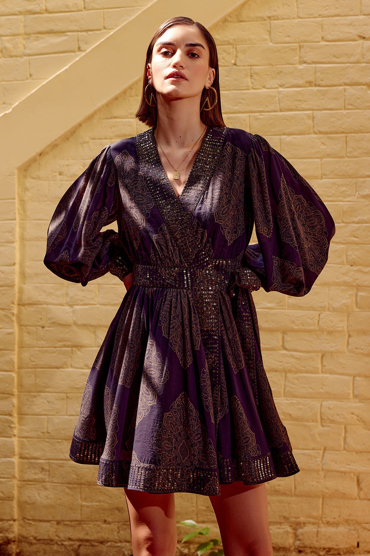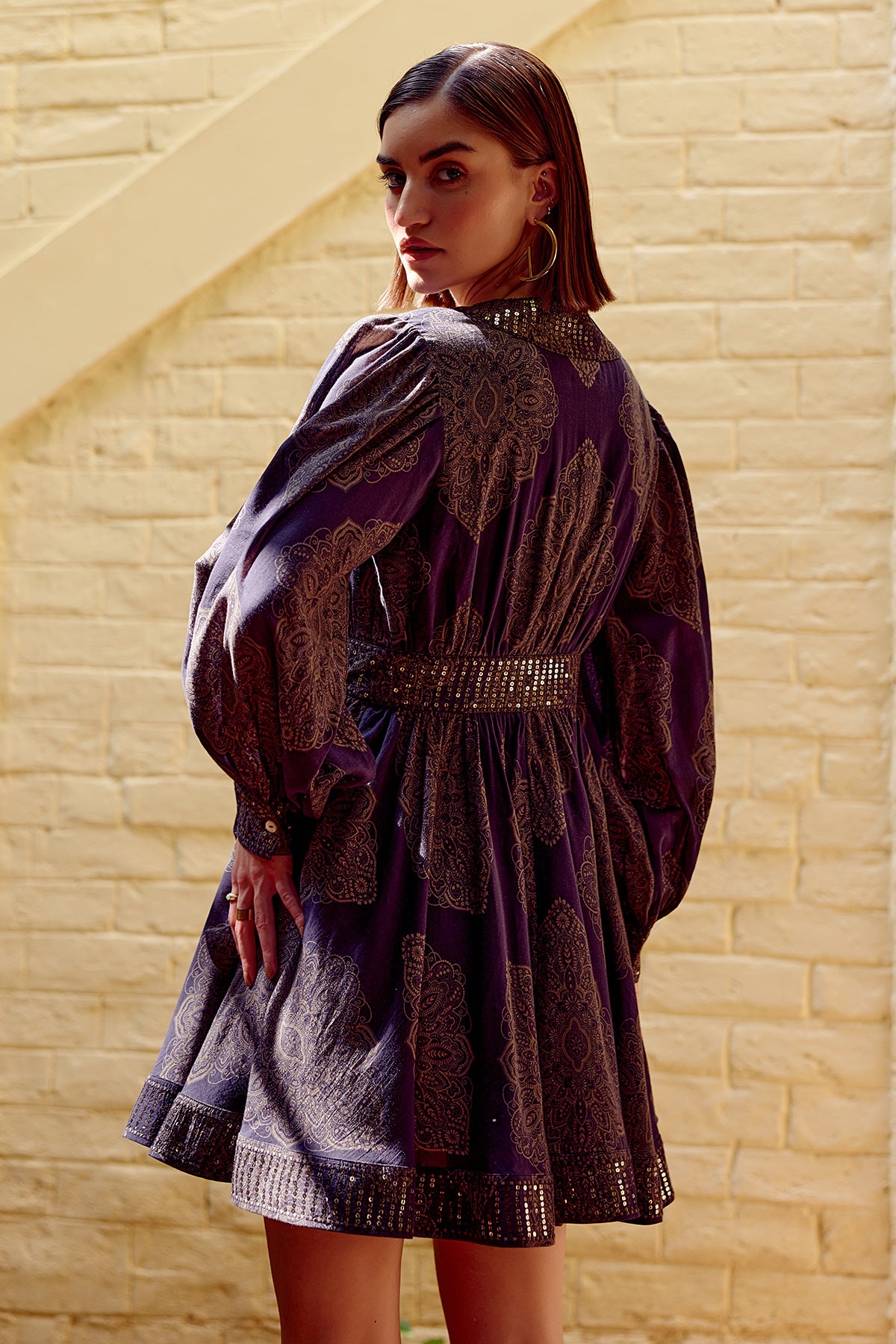 Elevating its charm, a thick border of shimmering sequins adds a luxurious sparkle, while the embroidered cuffs on the full sleeves bring in refined artistry. Fully lined for comfort and ease, this mini dress transitions effortlessly from day to night.