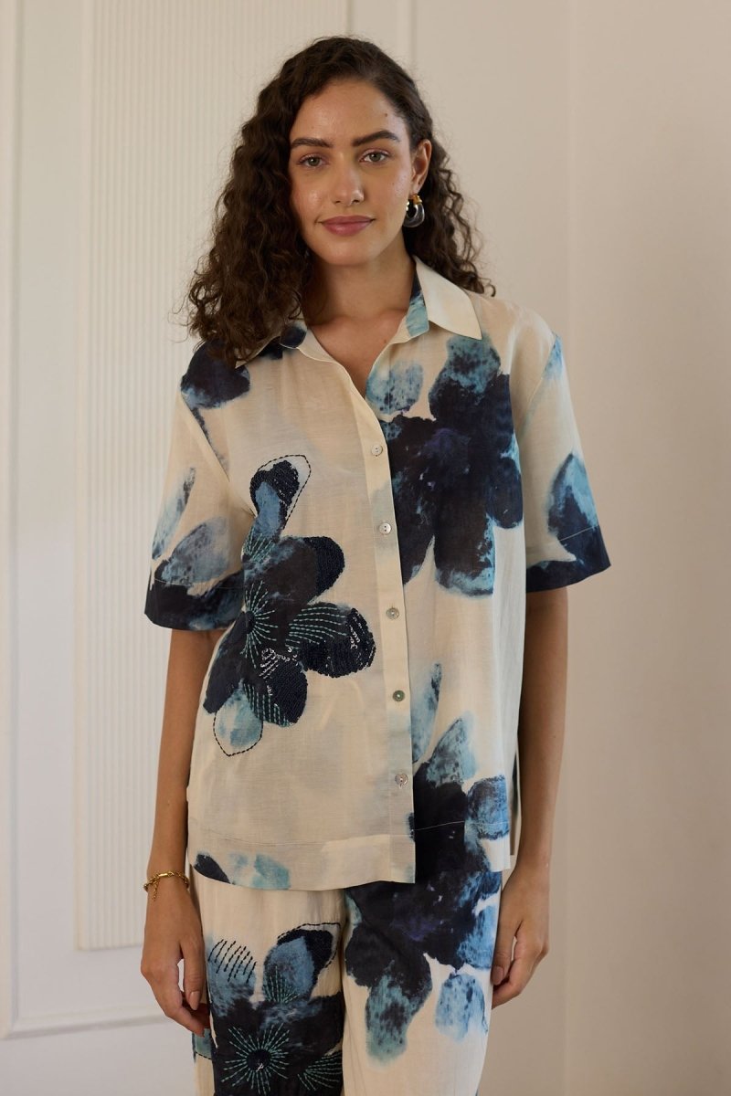 This shirt features a captivating print of blue abstract flowers, with one flower enhanced by delicate hand embroidery for a touch of sophistication. The intricate detailing brings the design to life, blending modern art with timeless elegance.
