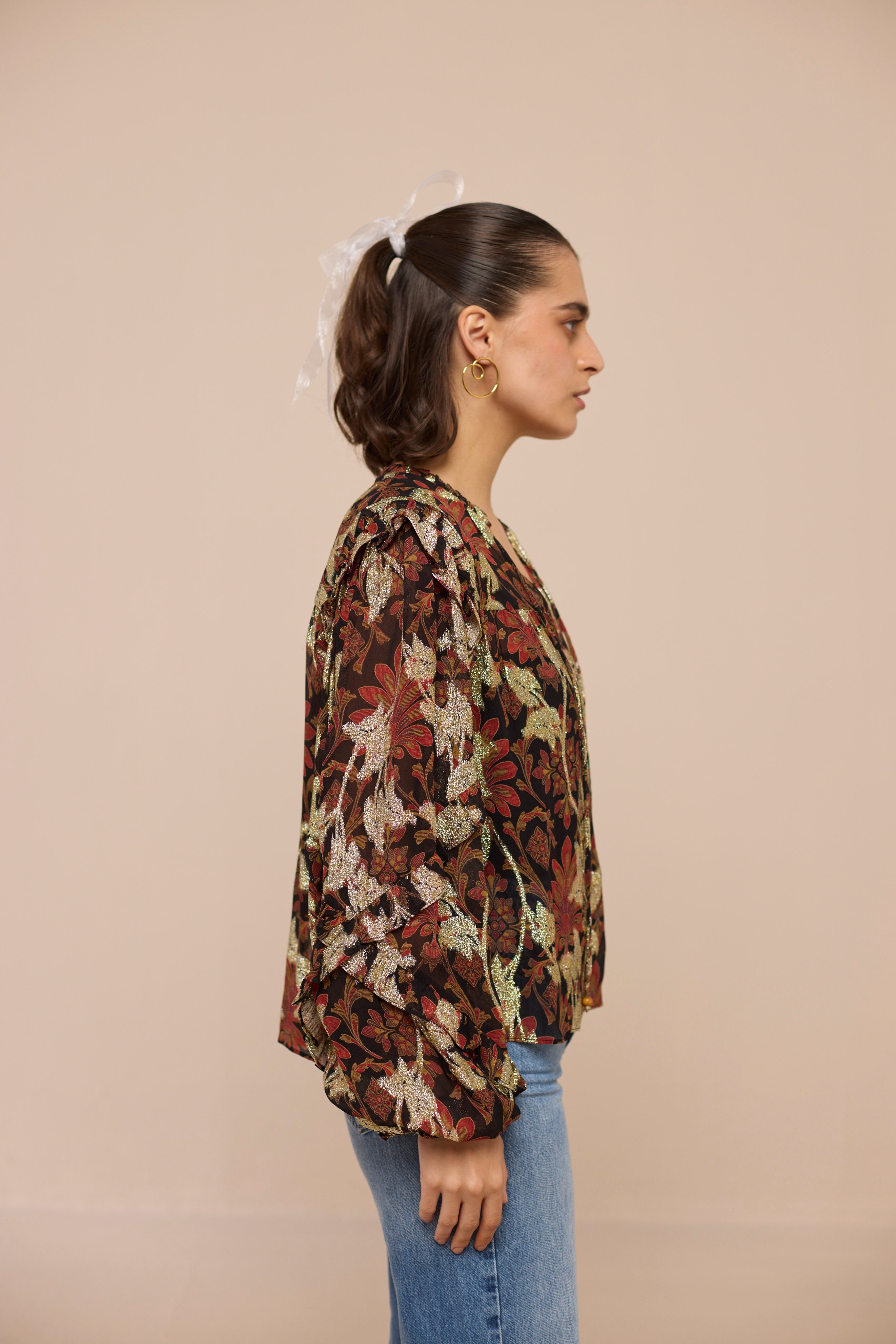 Horizon blouse features an elegant tie-neck detail that adds a touch of refinement to your ensemble. Delicate frills adorn the shoulders and sleeves, enhancing the blouse with a whimsical charm. With a subtle touch of gold accents, it exudes understated glamour and allure.