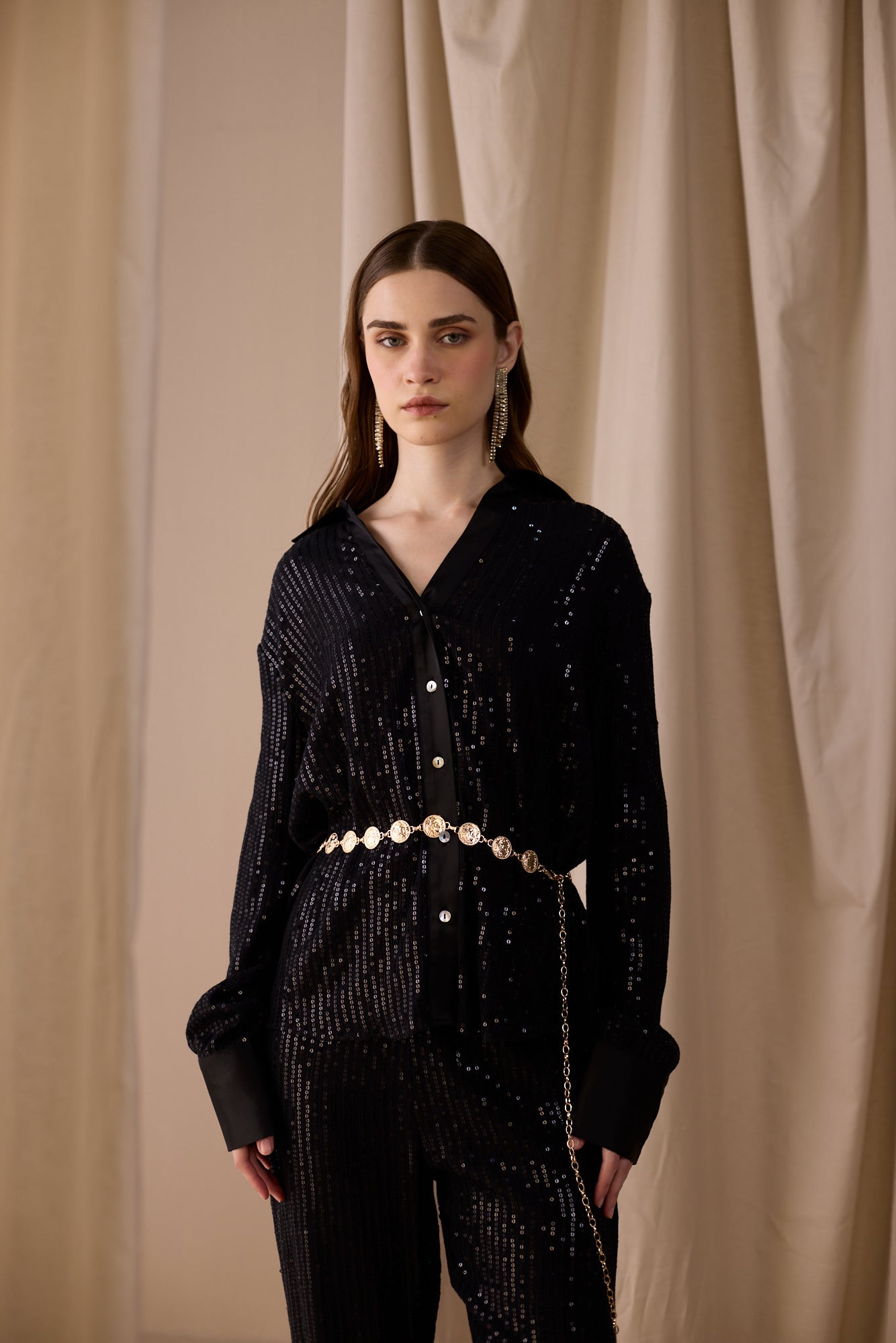 Bold and glamorous, the Black Sequin Shirt is designed to dazzle. In a timeless black hue, it shimmers with all-over sequins while satin detailing at the placket, collar, and cuffs adds luxe contrast. Finished with mother-of-pearl buttons, it’s a statement piece that speaks for itself—made for nights when you want all eyes on you.