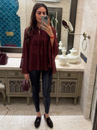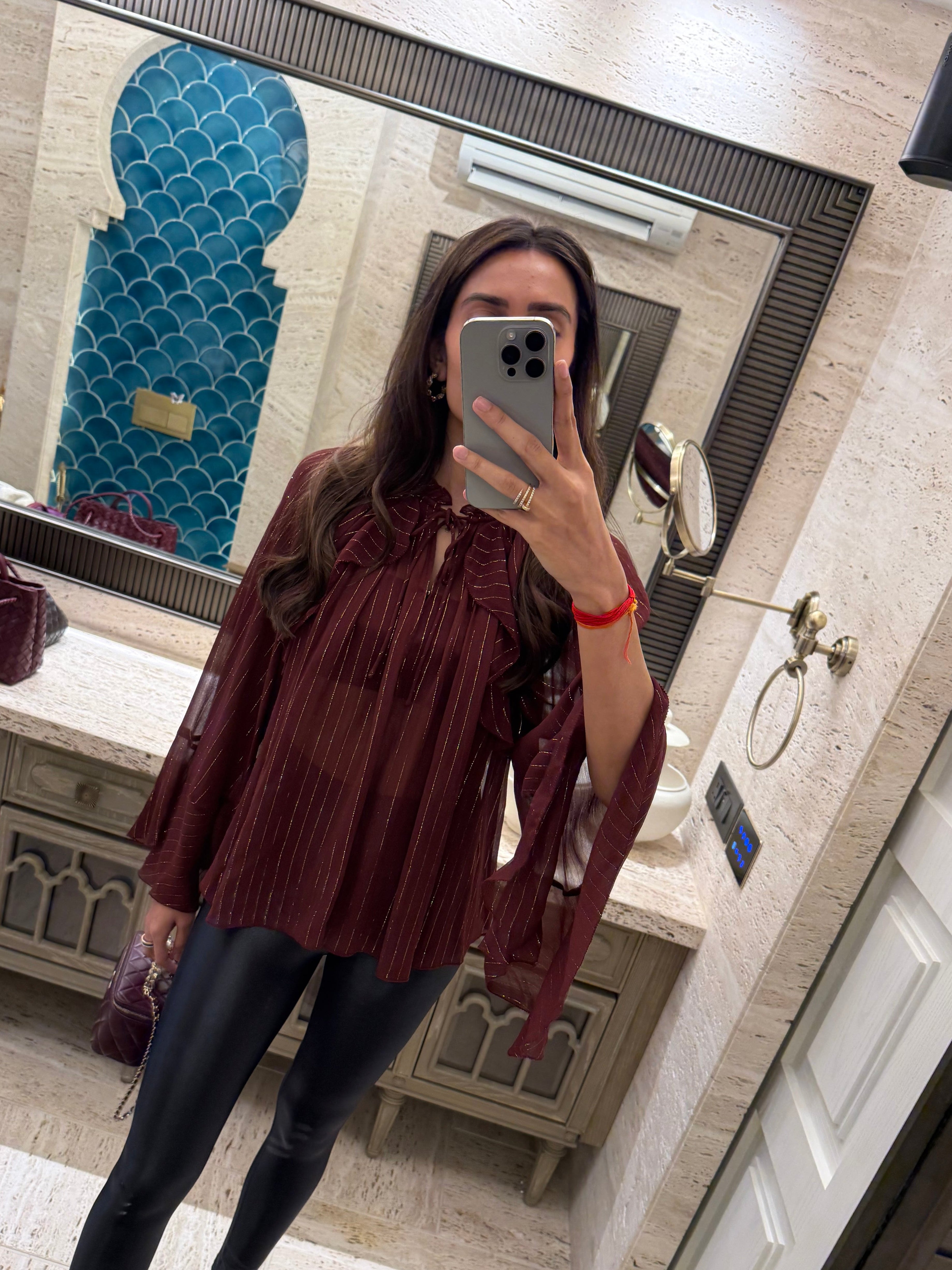 Luxurious and timeless, this merlot blouse with delicate gold lurex threads brings subtle shimmer and sophistication to any look. Designed with soft frills at the shoulder and gently flared sleeves, it’s the perfect balance of feminine elegance and modern ease—ideal for everything from daytime gatherings to evening soirées.